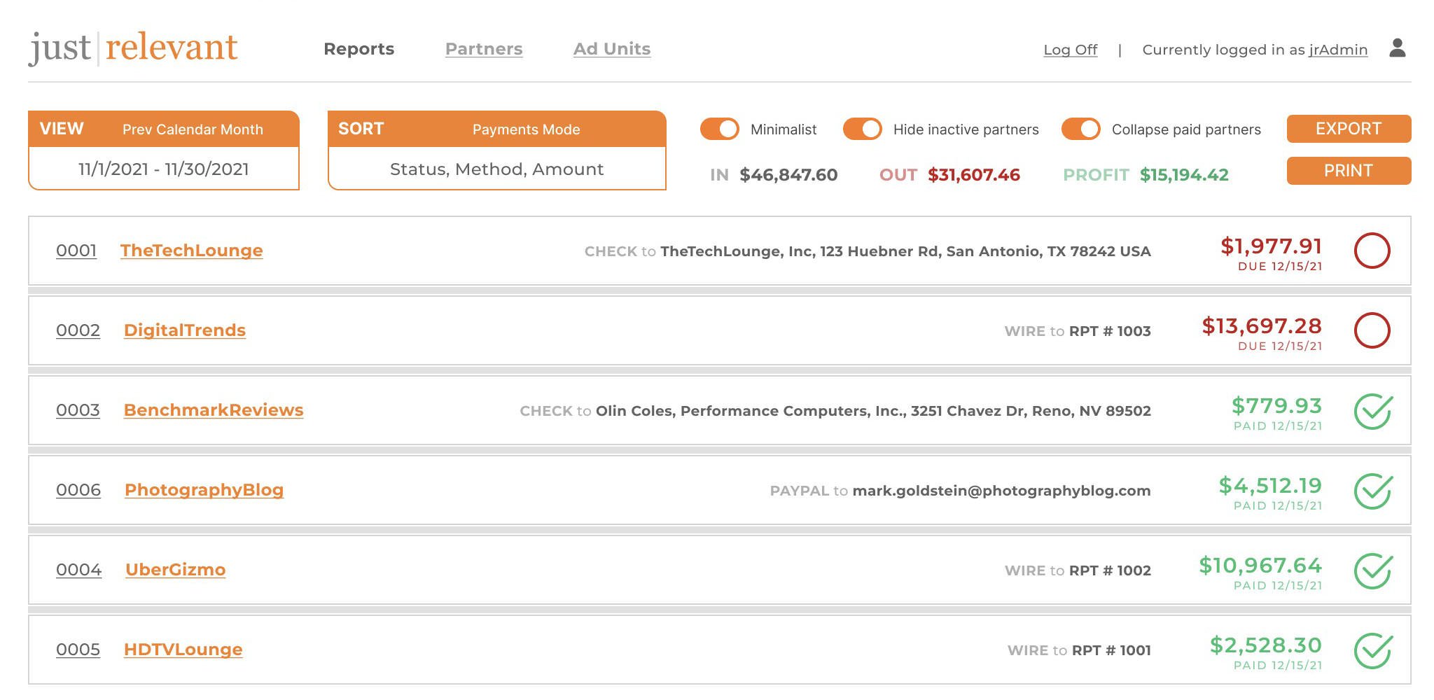 Minimalist Toggle - OFF by default. There is a lot of information presented in the default view, but when it comes time to actually pay partners each month, for example, far less information is needed and it make it easier for the user when presented with less information. Overall earnings report is hidden, contact information is hidden and replaced with Payment Method and Payment Details, and all alerts and graphs are hidden.